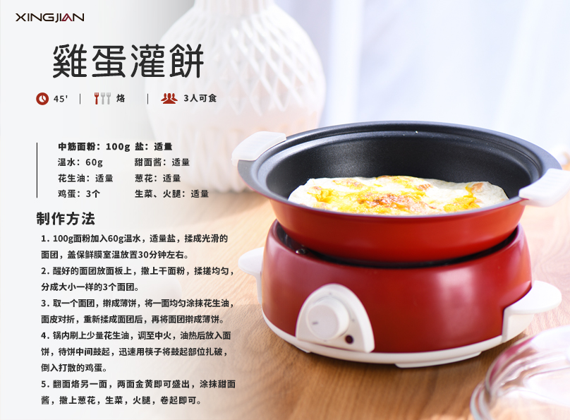 5:翻面烙另一面,两面金黄即可盛出,涂抹甜面酱,撒上葱花,生菜,火腿,卷起即可。